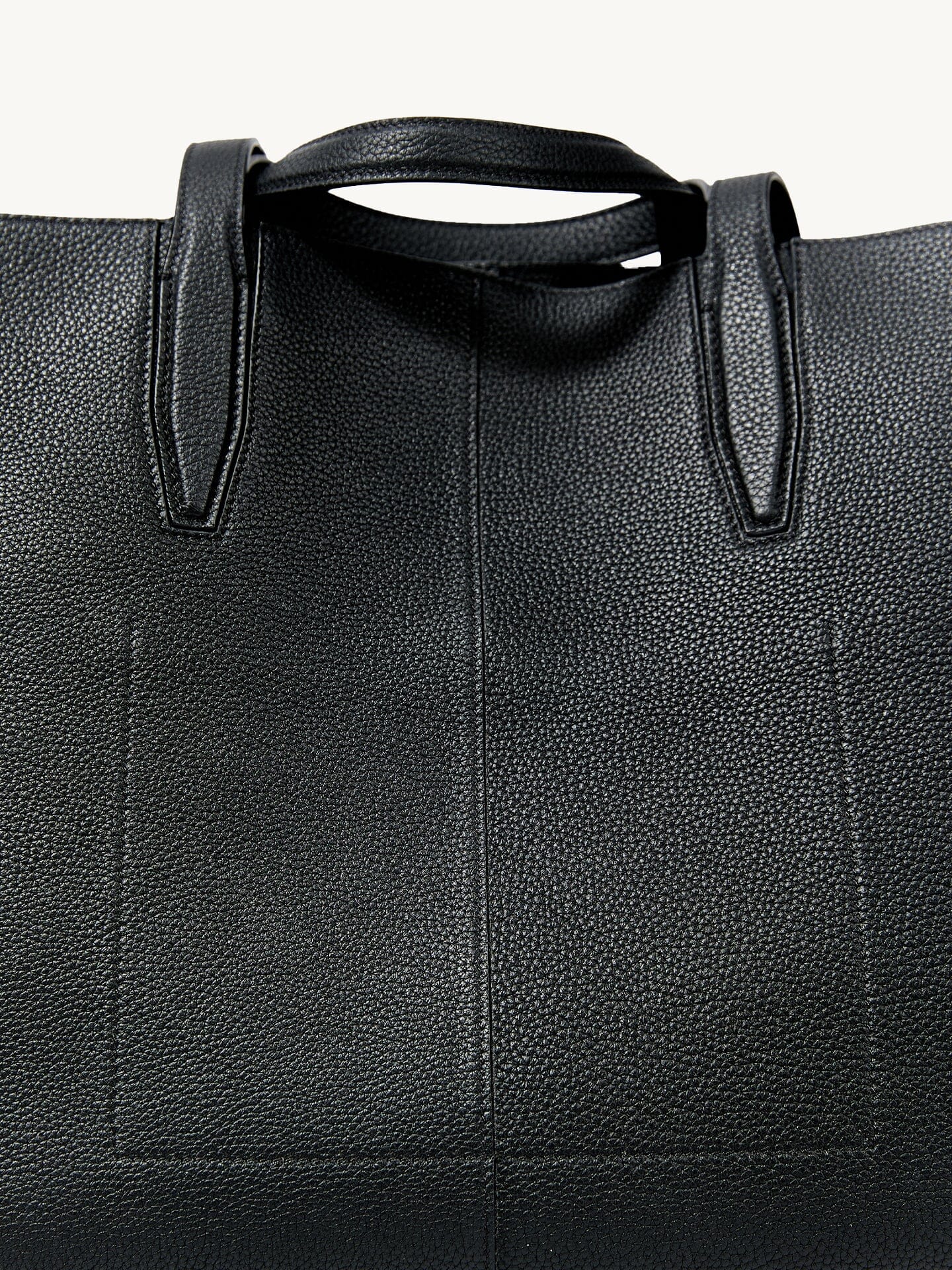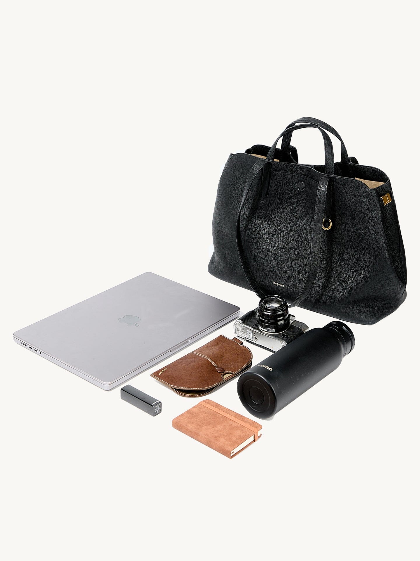 حقيبة اليد الكبيرة هي حقيبة يد بسيطة تتميز بملمس خفيف الوزن ولكن فاخر، مصممة للرحلات الاستكشافية دون عناء. يتيح التصميم المفتوح من الأعلى سهولة الوصول، بينما يتناسب الجزء الداخلي الفسيح بشكل مريح مع جهاز كمبيوتر محمول مقاس 16 بوصة.