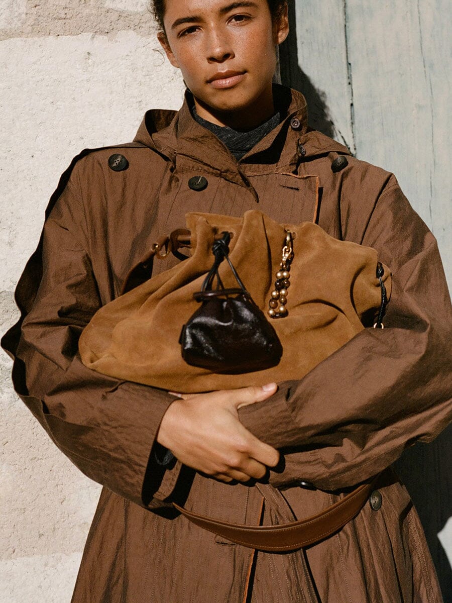 مصنوع من طبقة أولى ناعمة ومتينة وخفيفة الوزن من جلد البقر نابا، ويخضع هذا الجلد لعمليات مثل صباغة الماء ورش الألوان وتثبيت اللون، مع الاحتفاظ بحبيباته الطبيعية مع إظهار اللون البني المحمر العميق من مسافة ومزيج من الأسود والأحمر عن قرب. مع الاستخدام اليومي، يصبح الملمس أكثر وضوحًا، وفي الزوايا والمناطق المرتفعة، يظهر تأثير ثنائي اللون تدريجيًا، تاركًا وراءه آثارًا شخصية للوقت.