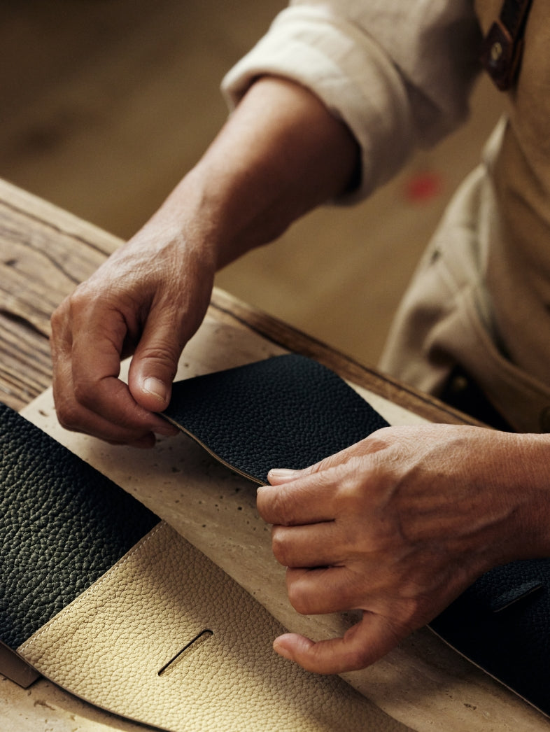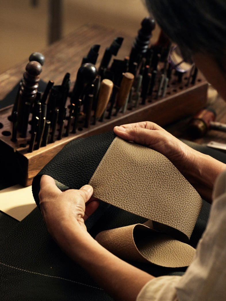 Es besteht aus importiertem, doppelt gefärbtem Nappaleder und entwickelt im Laufe der Zeit eine einzigartige zweifarbige Patina.