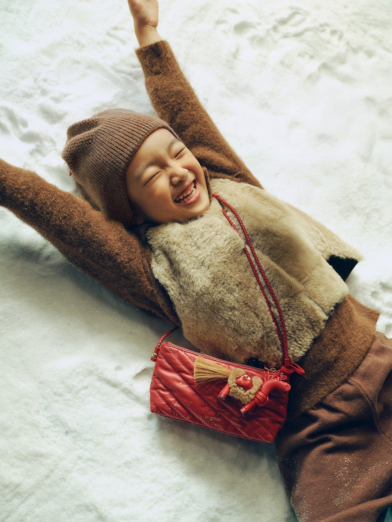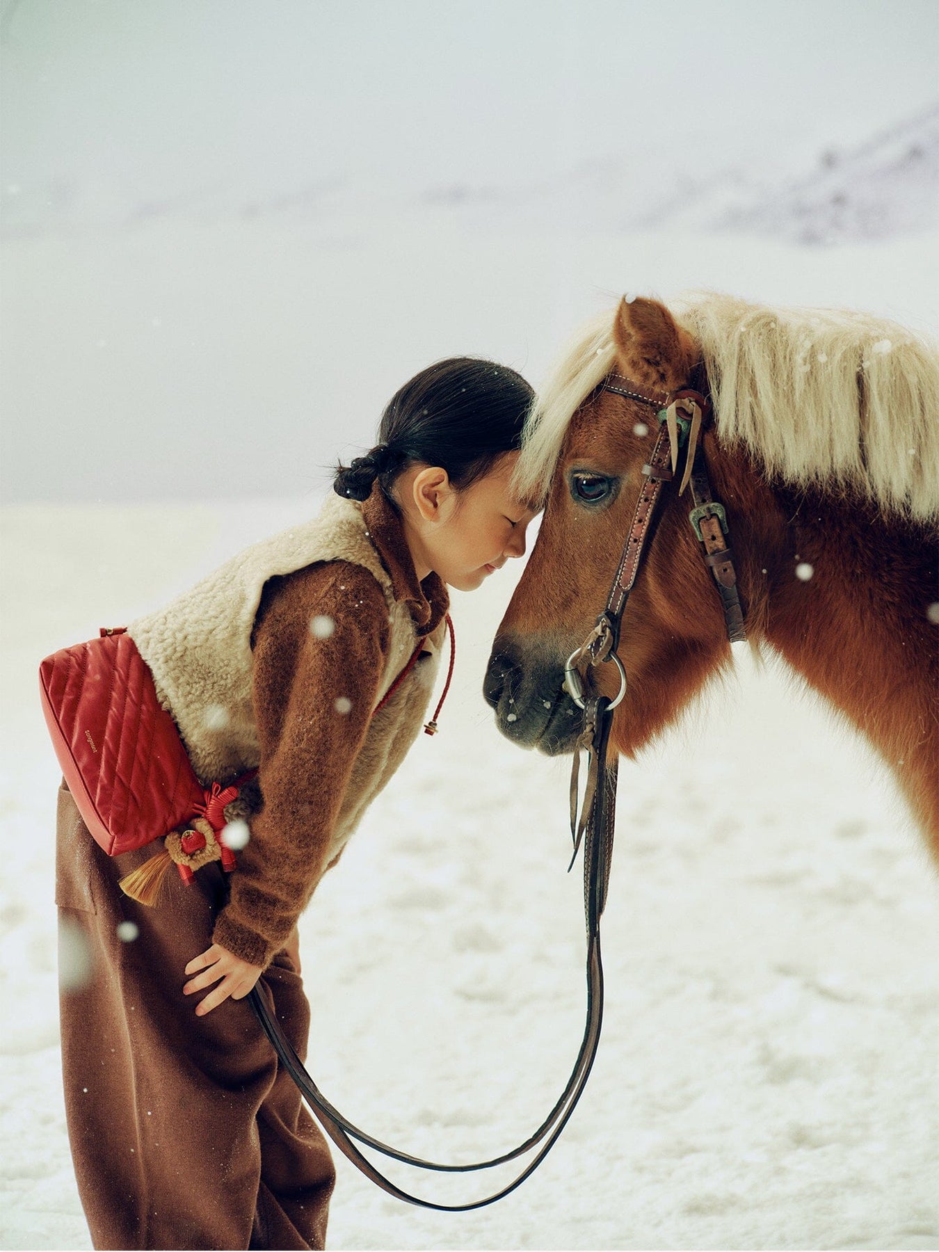 The body is sketched with strokes of mane and ears, prancing through snow and blossoms. A shearling saddle carries a mini tumbled leather pouch, where small coins suggest "fortune swiftly arriving." The wool-blend tail, dense and silky, sweeps bad fortune away.