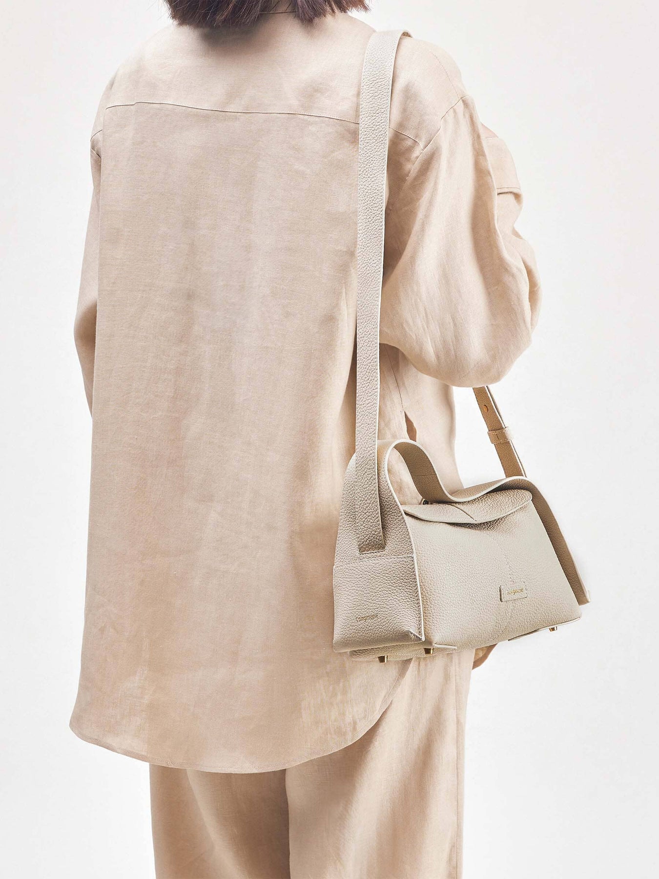 Indulge in the artistry of the small Drippy Roof Bag, meticulously crafted with premium leather that offers a structured shape with a supple touch. It forms a relaxed and organic streamlined silhouette when filled with your belongings, creating an effortless style.
