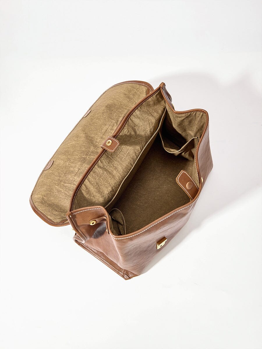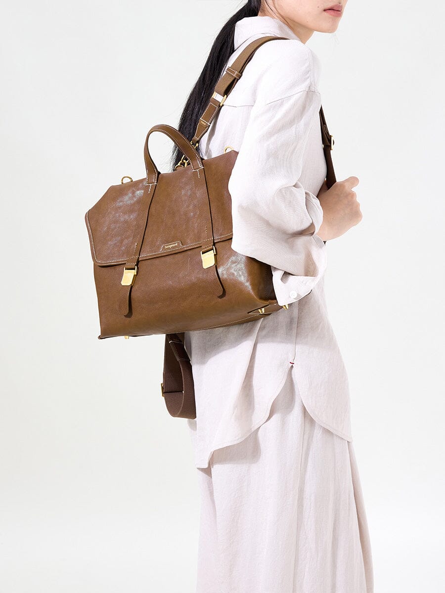Made from vegetable-tanned leather with a timeless feel, The Small Shan Briefcase will become more lustrous with time. Treated with special techniques, the leather surface features natural and irregular textures, signifying traces of time. The hardware draws inspiration from the book clasps found in the book bags of wandering monks, utilizing a jewelry-grade vacuum-electroplated manufacturing process that imparts a vintage feel. The buckles open and close in a second, offering convenience and security, and are engraved with patterns expressing Songmont’s natural philosophy.