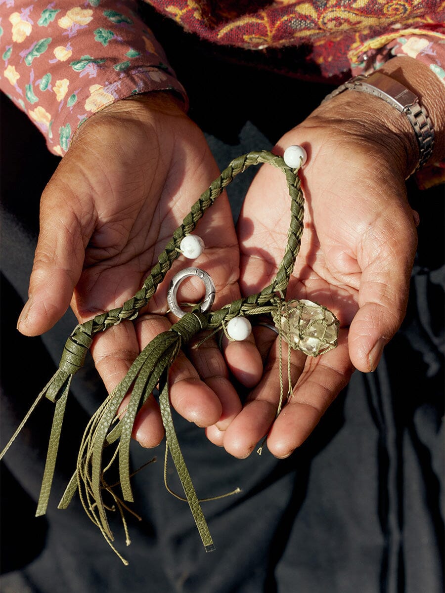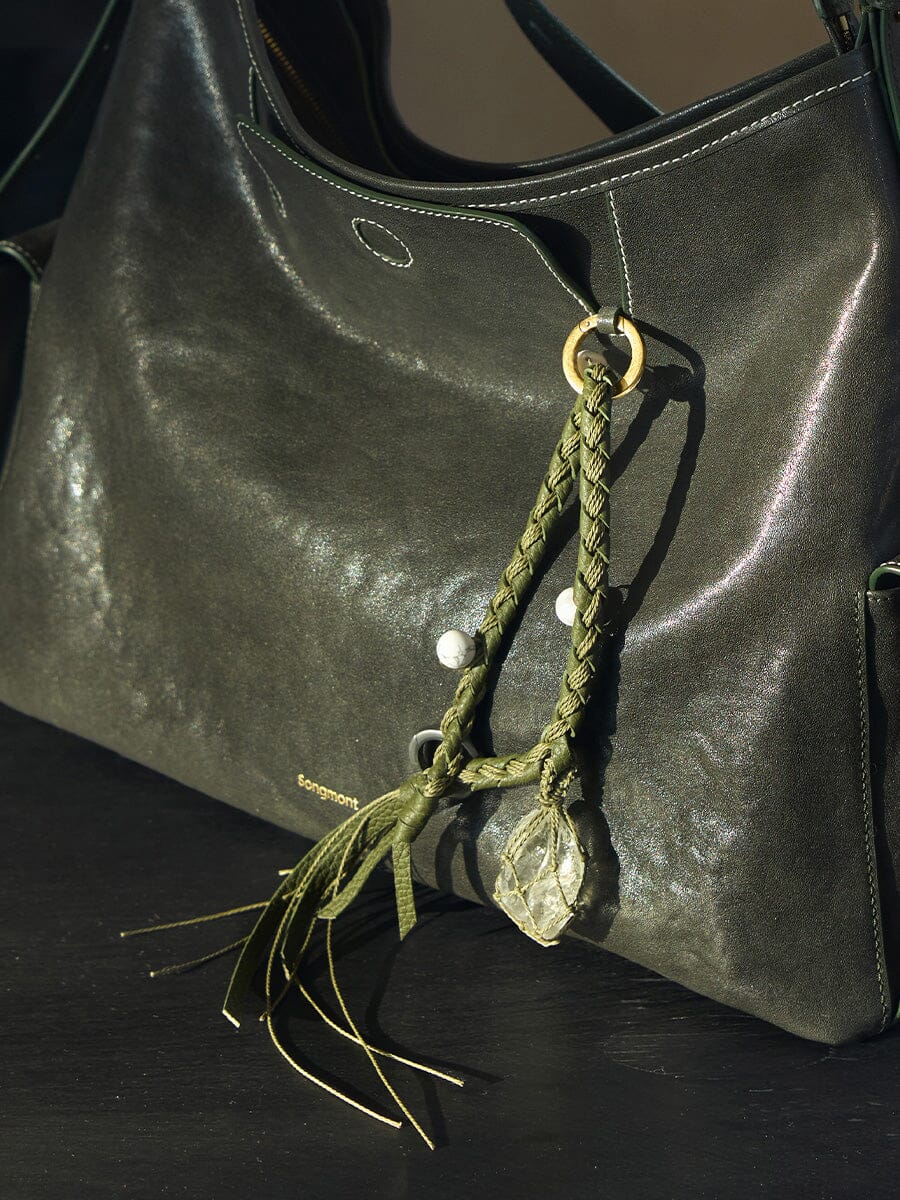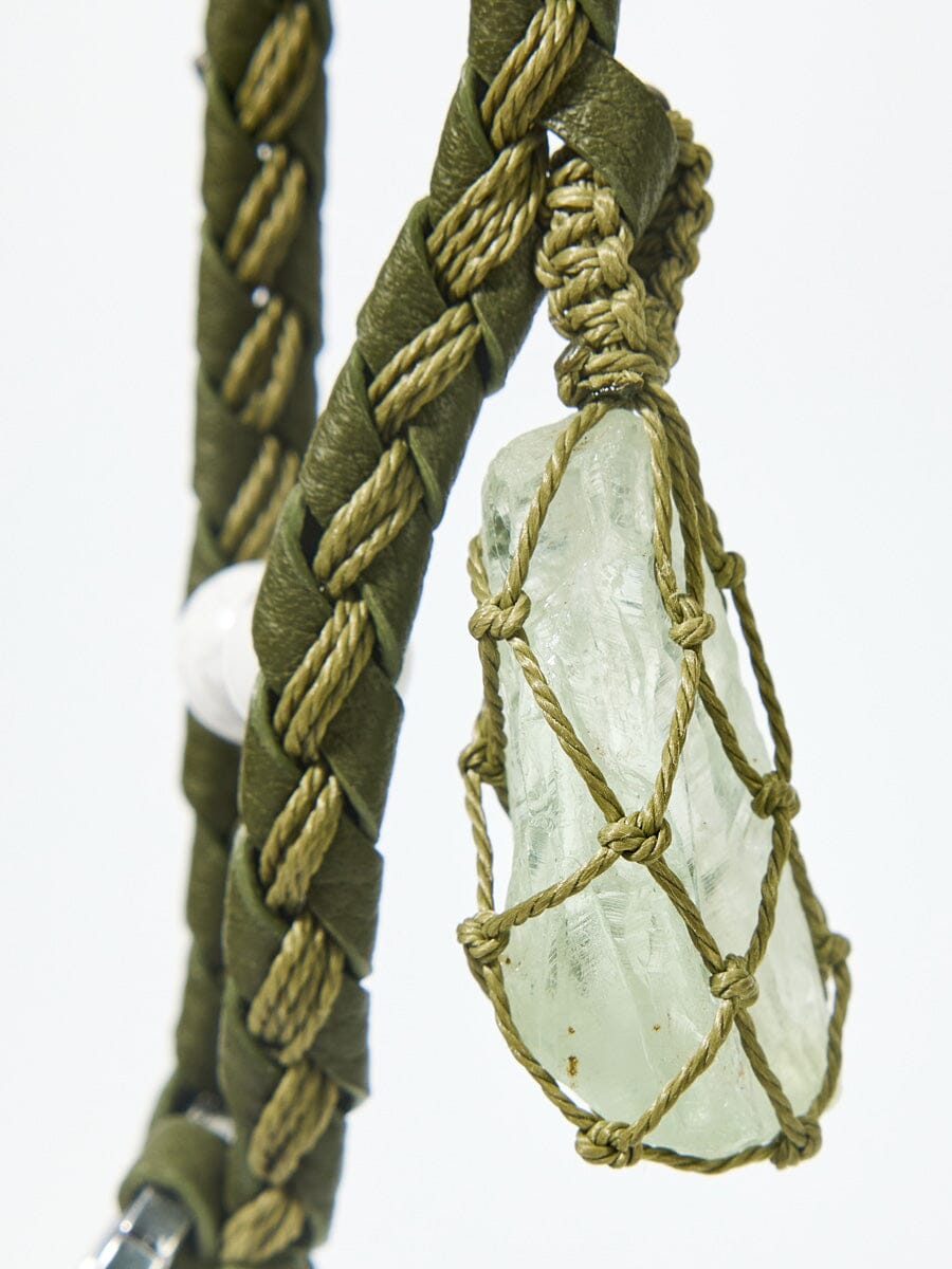 Natural crystals, purified over time, develop pure and translucent textures and colors. Rare and precious, they are woven with cords and hung on bags, like tiny universes, offering healing to your soul.
