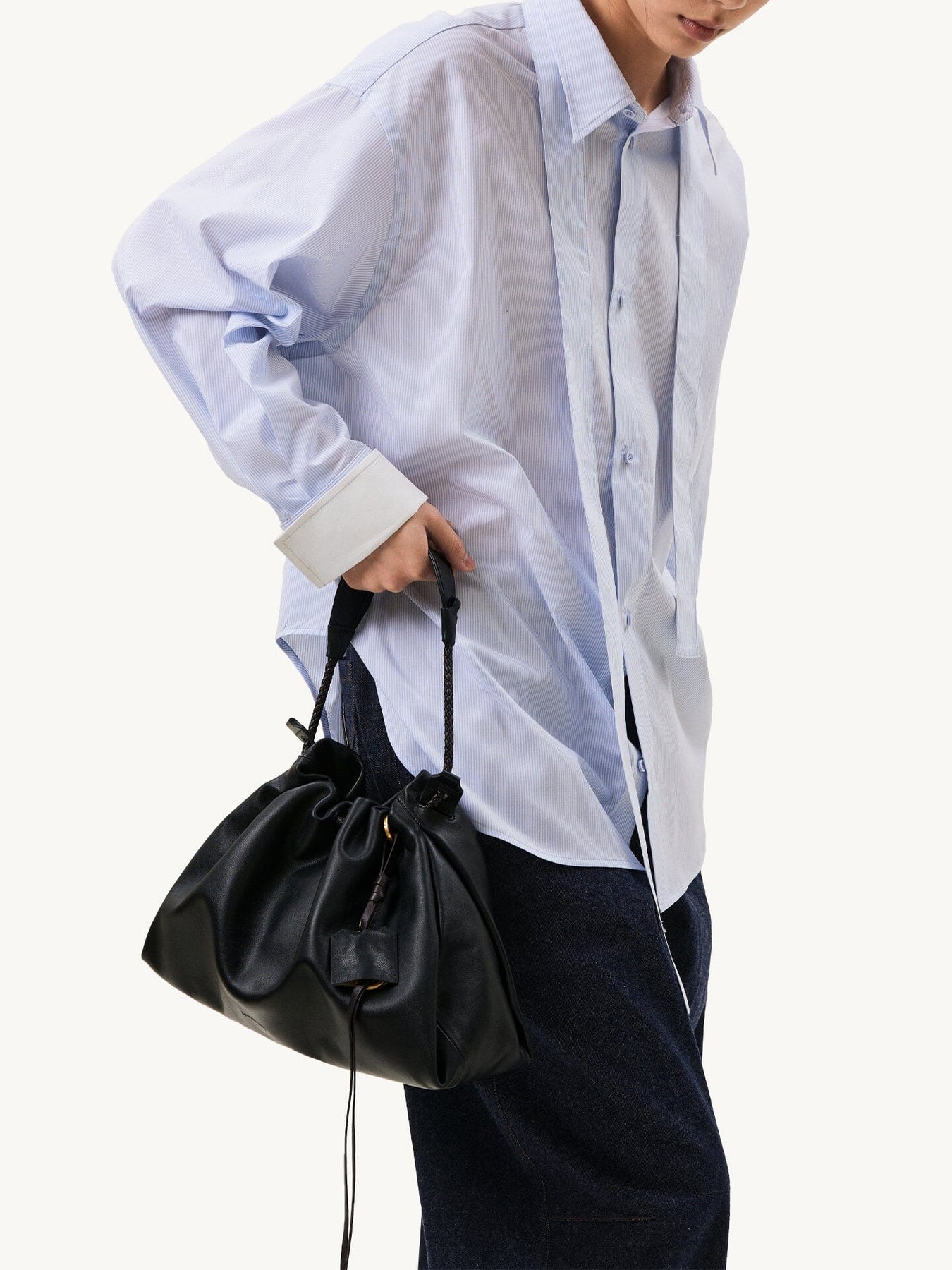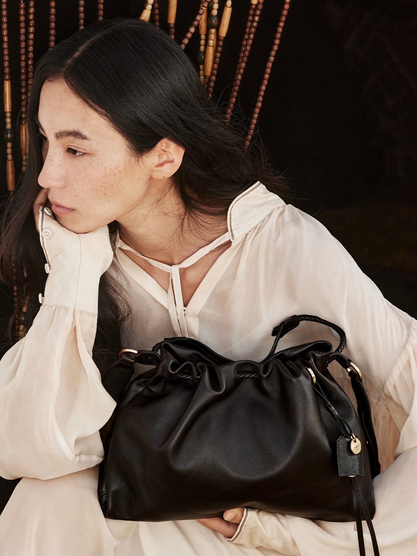 Le cuir est fabriqué à partir de cuir de vache Nappa première couche de première qualité, connu pour sa douceur, sa durabilité et sa légèreté. La doublure offre un toucher exceptionnellement doux. Il présente une texture naturellement chinée et lavée, évoquant les empreintes organiques laissées par l'eau qui coule sur les rochers.
