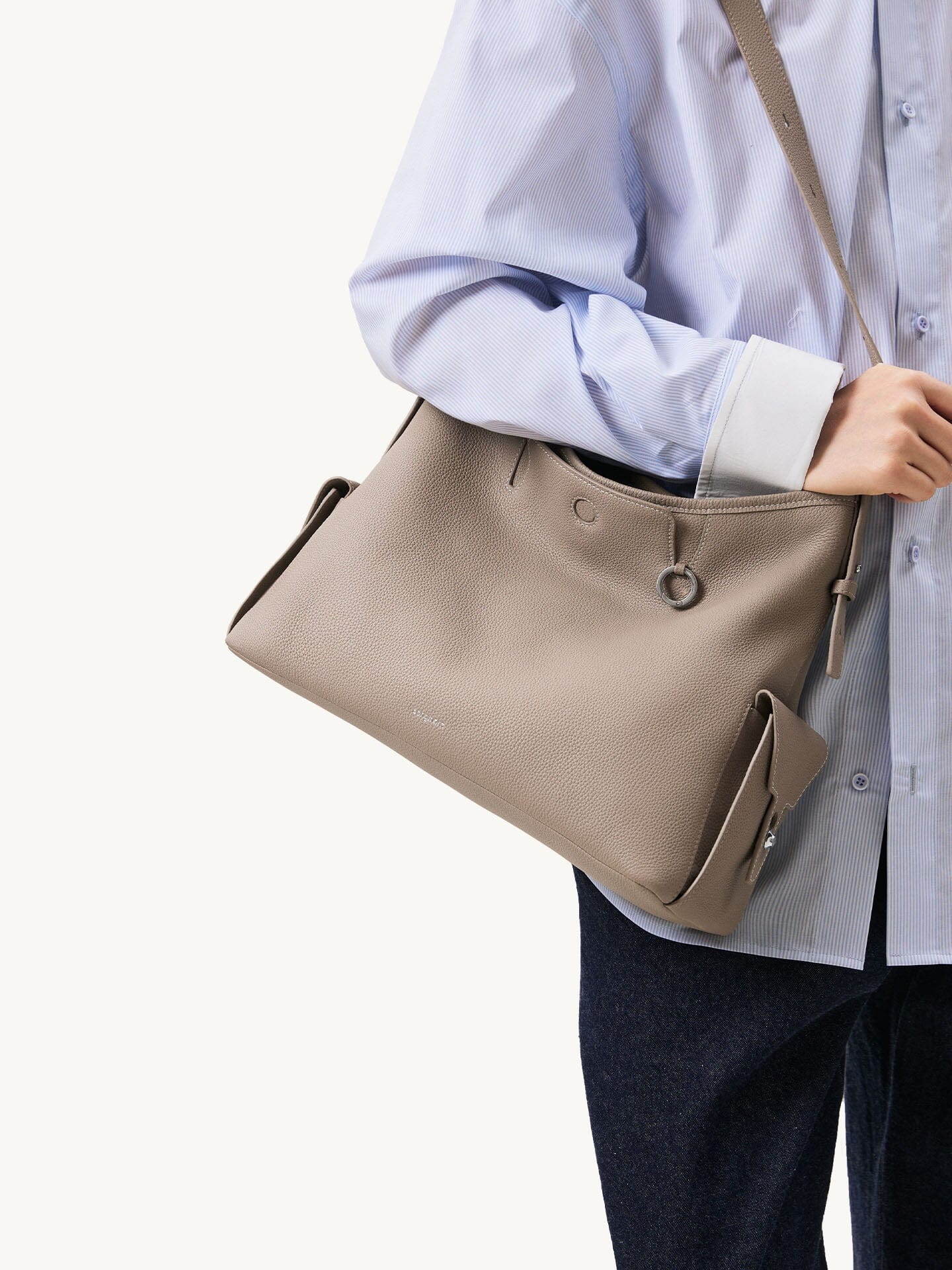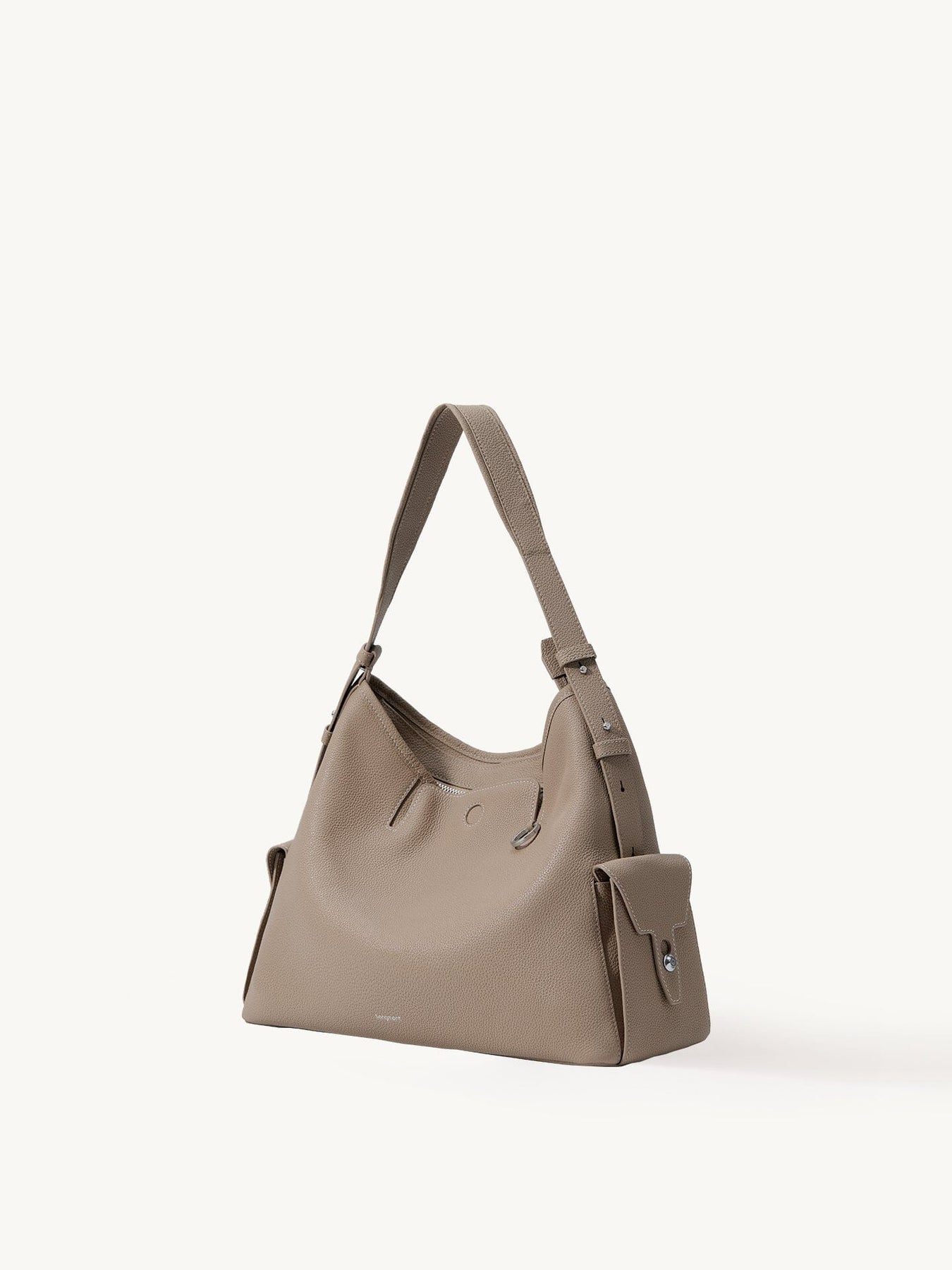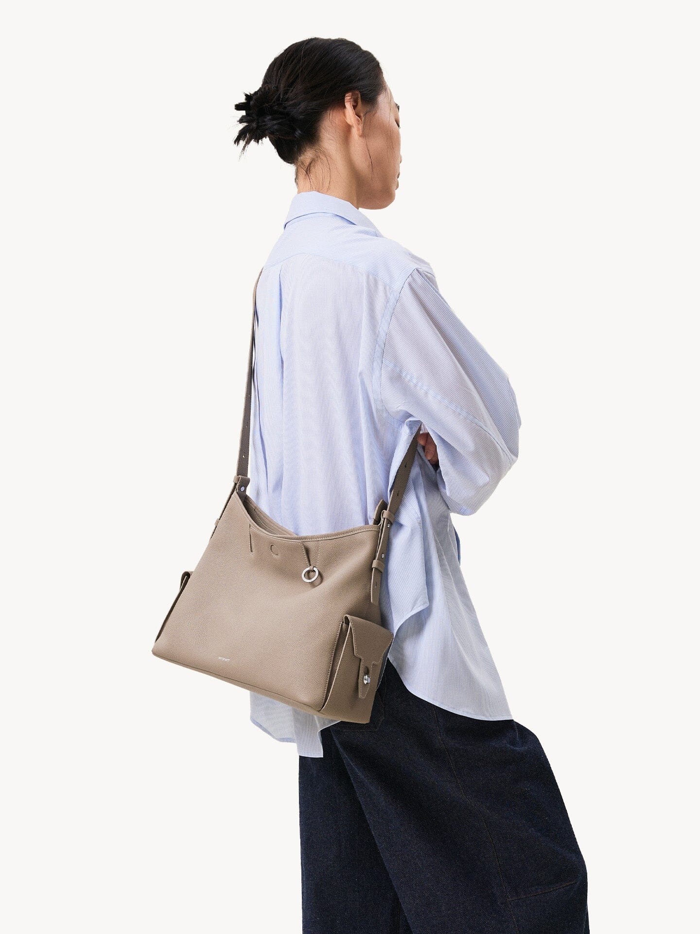 Made of full-grain tumbled leather, this Bag features multiple exterior patch pockets to keep your essentials. The charm holder allows you to attach any accessories you prefer. The bag includes a zipper closure and a spacious opening for easy visibility of contents. Inside, you'll find compartments for organized storage. The adjustable strap is designed to be wider and softer in the center for improved shoulder comfort.
